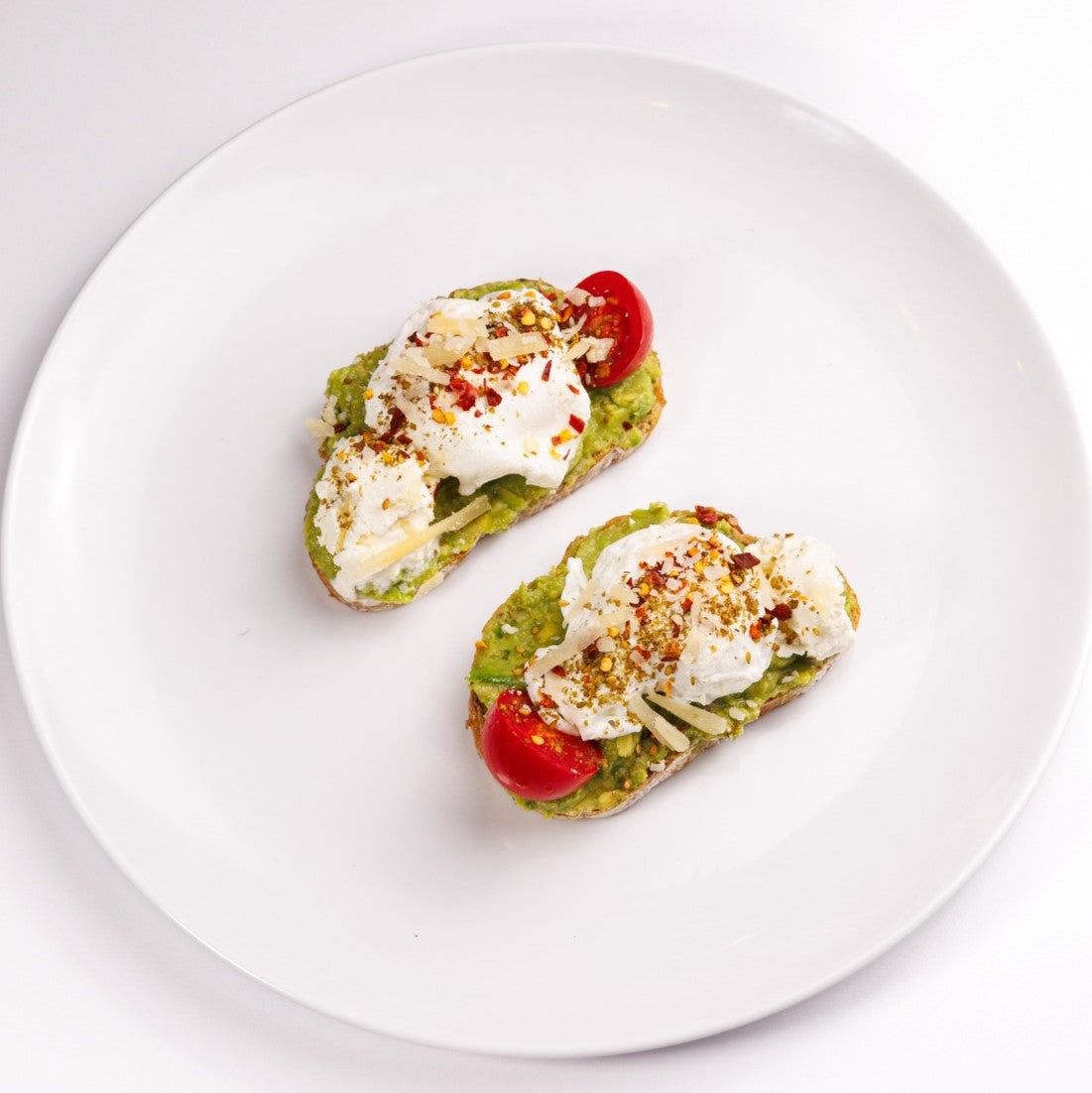 Avocado, 2 poached eggs, cream cheese, zaatar, chili flakes, cherry tomatoes, parmesan cheese, served on German bread.
