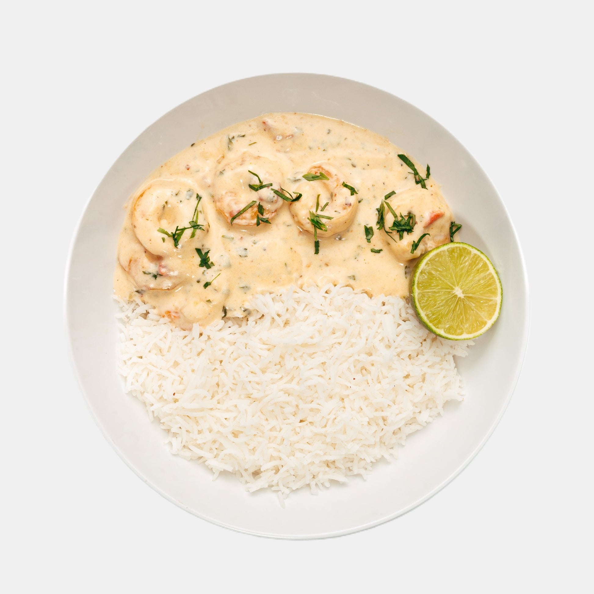 Creamy shrimp with steamed rice, tomatoes and coriander leaves.