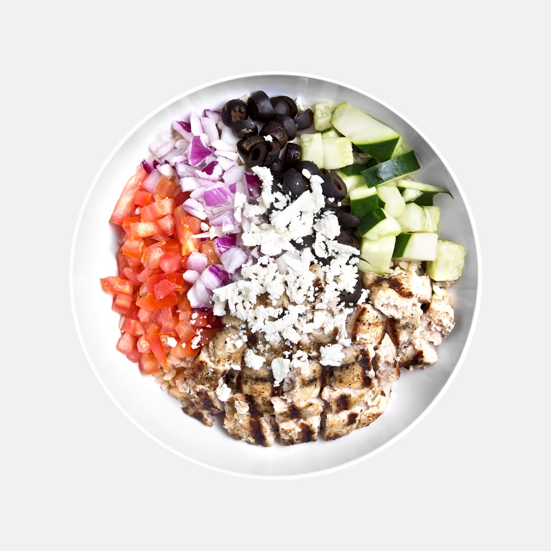 Grilled hormone-free, cage-free chicken, tomatoes, black olives, cucumber, red onions, feta cheese, balsamic sauce and white rice.