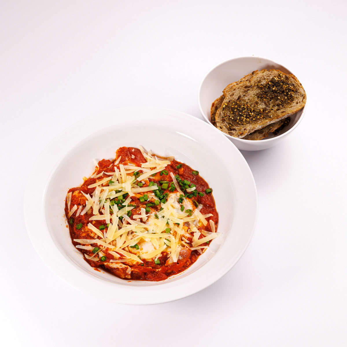3 eggs, peeled tomato, cilantro, spring onion, parmesan cheese, served with Arabic bread.